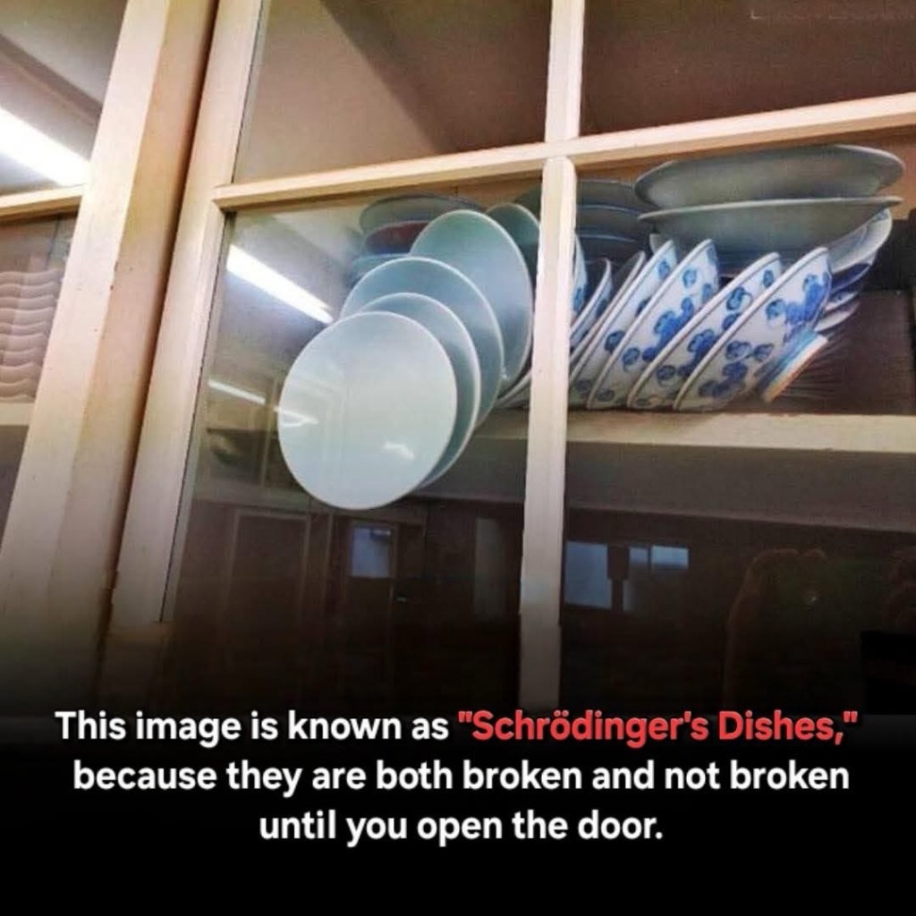 Known as Schrödinger’s Plates, this curious image offers a reflection inspired by quantum physics. According to the idea, until the cabinet door is opened, the dishes stored there are in two states simultaneously: broken and unbroken.